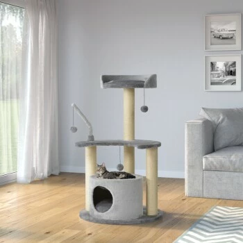 Aufgrund der 3 Plattformen ist der Kratzubaum Evie für mehrere Katzen geeignet und bietet mit seinen starken Sisalsäulen die perfekte Möglichkeit die Krallenpflege Ihrer Katze zu unterstützen. Im Inneren der Höhle befindet sich ein herausnehmbares und waschbares Kissen. Die bequeme Hängematte auf der Höhle rundet das Gesamtpaket ab und sorgt für gemütliche Ruhephasen.