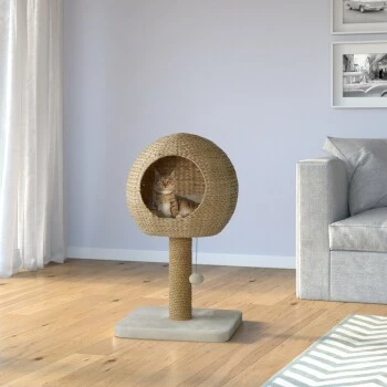 Sowohl die Höhle als auch der Kratzstamm des AniOne Kratzbaums Taro sind aus natürlicher Wasserhyazinthe gefertigt, die dem Kratzbaum nicht nur seine hochwertige und moderne Optik verleiht sondern zudem noch für eine hohe Luftdurchlässigkeit der Kuschelhöhe sorgt. Diese ist mit einem weichen und bequemen Liegekissen ausgestattet, das bei Bedarf auch ganz leicht entnommen und bei 30° gewaschen werden kann. Der Kratzbaum eignet sich ideal für kleine bis mittelgroße Katzen und findet aufgrund seiner Größe selbst in kleinsten Haushalten Platz. So schenkt dieser AniOne Kratzbaum nicht nur dank seines wunderschönen Aussehens und seiner natürlichen Materialien lange optische Freude sondern bietet Ihrer Samtpfote auch genau das was sie braucht: Eine kuschelige Höhle zum Zurückziehen und Beobachten sowie robustes, umweltfreundlicheres Sisal für ausgiebigen und langanhaltenden Kratzspaß.