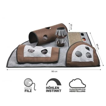 Lassen Sie Ihren vierbeinigen Liebling sich seine Leckereien verdienen. Verschiedenste Verstecke laden zum Suchen und Herumtollen ein. In jedem Tunnel, Turm oder Versteck sind Löcher eingelassen, sodass Ihre Katze mit der Pfote hindurch kommt und die integrierten Spielbüschel inkl. Glöckchen einfangen kann. Erleben Sie gemeinsame Stunden voller Spielspaß beim Kratzen, Suchen und Spielen. Fordern Sie Ihre Katze! Beschäftigung pur, durch aktives Spielen und Instinktförderung. Interaktives Spielen hat noch nie so viel Spaß gemacht! Und sollte mal nicht genügend Platz für den gesamten Spielteppich vorhanden sein, lässt sich das Kratzbrett inkl. Spielschiene vom Teppich lösen und einzeln verwenden. Als „kleiner Bruder“ des Activity Teppichs ist dieser Teppich auf Grund seiner Form hervorragend für die Verwendung in einer Zimmerecke geeignet!