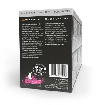 Unser getreidefreies Monoprotein-Nassfutter enthält je Sorte nur eine tierische Proteinquelle. Die bewusst kurzgehaltene Zutatenliste besteht aus über 98 % Fleisch/Innereien/Fisch und Kochsud, ergänzt mit Mineralstoffen und hochwertigem Öl. So wird catz finefood PURRRR zu einer exquisiten Mahlzeit für kleine Feinschmecker. Wie alle catz finefood Produkte ist das leckere Alleinfuttermittel frei von Aroma-, Farb- und Konservierungsstoffen sowie Zuckerzusätzen. Aufgrund der Nachhaltigkeit und unserer Tierliebe lassen wir catz finefood PURRRR gentechnik- und tierversuchsfrei in Deutschland herstellen. Auch für Katzen mit Futtermittelunverträglichkeiten ist unsere Feinkost gut bekömmlich und eignet sich hervorragend für eine Ausschlussdiät. Der pure Fleischgeschmack überzeugt alle kleinen Gourmets.