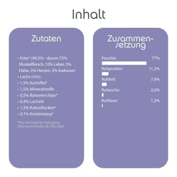 Die Zusammensetzung des Nassfutters: 94,50% Bio-Ente* (Muskelfleisch, Herz, Karkasse, Leber) 1,50% Kokosflocken* 1,50% Kürbis* 1,50% Kartoffel* 0,50% Bananenchips* 0,40% Lachsöl* 0,10% Knotentang*