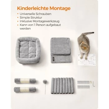 – Da Katzen gerne springen und spielen, befestigen Sie den Kratzbaum bitte mit dem mitgelieferten Kippschutz an der Wand, um ihn sicher zu verwenden.