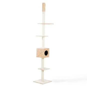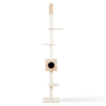 Er ist aufgrund seiner Größe sehr platzsparend. Die Höhe des ist zudem verstellbar von 2,40 m auf bis zu 2,60 m. Er bietet zahlreiche mit Plüsch bezogene Sitz- und Liegeflächen zum Relaxen und Beobachten. Die integrierte Höhle gibt deiner Samtpfote die Möglichkeit, sich auch mal zurückzuziehen. Klettern strengt schließlich an 😉
