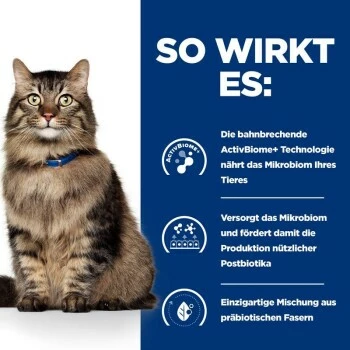 Die Verdauung Ihrer Katze kann durch viele Dinge beeinträchtigt werden und wenn Ihre Katze Verdauungsbeschwerden hat, kann dies für alle Beteiligten wirklich sehr unangenehm sein. Die gute Nachricht aber lautet, dass Sie Ihrer Katze helfen können, sich besser zu fühlen, und zwar mit einer Nahrung, die das Management von faserresponsiven Verdauungsstörungen revolutioniert: Die Gesundheit des Mikrobioms des Darms, also des einzigartigen Ökosystems des Darms Ihres Tieres, steht hierbei im Vordergrund der Unterstützung der Verdauung. Die Ernährungsexperten und Tierärzte von Hill’s haben Prescription Diet Gastrointestinal Biome mit ActivBiome+ entwickelt, eine einzigartige Technologie, die klinisch erwiesen einen regelmäßigen, gesunden Kotabsatz in nur 24 Stunden fördert und hilft, das Risiko für ein erneutes Auftreten zu reduzieren.