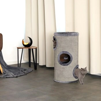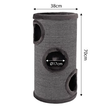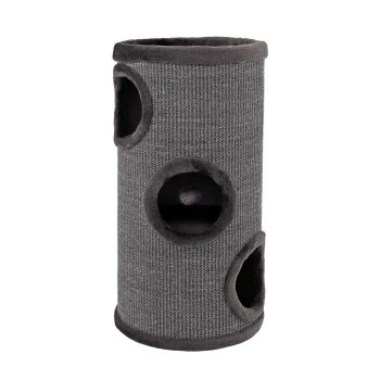 Dieser angesagte Kratzturm ist ein wahres Katzenparadies und eignet sich besonders als Rückzugsmöglichkeit, Spielbeschäftigung und zur optimalen Krallenpflege. Er ist durch mehrere Zugänge begehbar und bietet deiner Katze daher die Möglichkeit zum Klettern und Verstecken. Ein beweglicher Spielball im Inneren der Katzentonne weckt den Spiel-und Jagdtrieb. Die kuschelige Aussichtsplattform gibt deinem Stubentiger den Überblick über das gesamte Geschehen und eignet sich ideal zum gemütlichen Entspannen und als bequeme Liegefläche. Deine Katze kann an den strapazierfähigen Sisalflächen rundum jederzeit ihre Krallen wetzen und bleibt somit von deinen Möbeln fern. Im Gegensatz zu herkömmlichen Kratzmöbeln, bei denen Katzen lediglich an bestimmten Stellen ihre Krallen schärfen können, ist dieser Kratzstamm komplett mit Sisal umwickelt. Wir bieten dir die Höhen 50,70 und 100 cm und die Farben Beige, Braun und Grau an.
