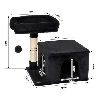 Ihre Katze kann sich an der robusten Sisalstange ausleben und ihre Krallen dabei optimal pflegen. Die Maße dieses kompakten Kletterbaums betragen 45x35x50 cm, der Durchmesser der Höhle 35 cm und des Liegebettes 40 cm.