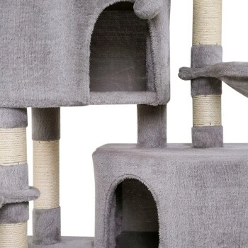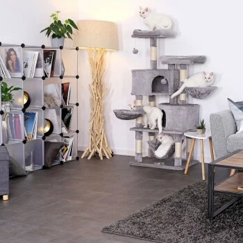 Mit diesem lionto Katzenspielhaus aus weichem Plüsch bleiben keine Wünsche Ihrer Samtpfote offen. Die kuscheligen Höhlen und die Hängematte laden zum Ausruhen und Verstecken ein und die hängenden Plüschbälle sorgen für den nötigen Spielspaß. Die einladenden Liegebetten und die Liegemulden sind ideal für die Ruhezeiten und das Beobachten der Umgebung. Die Stämme aus robustem Sisal unterstützen die Krallenpflege und halten Ihre Katze somit von den Möbeln fern. Sie können diese beachtliche Kratzsäule überall aufstellen und für einen echten Blickfang sorgen. Die Aufbauanleitung ist leicht verständlich und wird zusammen mit dem dementsprechenden Schraubenset mitgeliefert.