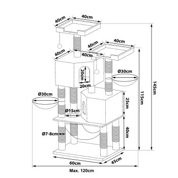 - Maße UND FARBEN. Dieses hochwertige Katzenzubehör verfügt über die Maße 60 x 45 x 145 cm, die Höhlen über 38 x 38 x 25 cm und das Plateau 35 x 35 cm. Das langlebige Spielzeug ist in der Farbe hellgrau und dunkelgrau erhältlich.