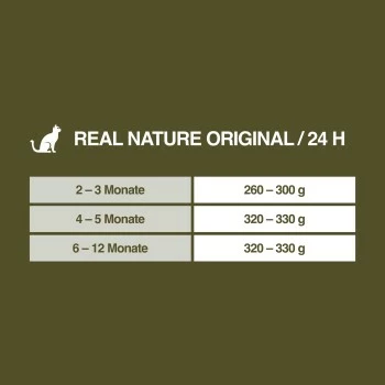 REAL NATURE verbindet eine natürliche Ernährung und hochwertige Zutaten: Feine Ingredienzien aus der Natur werden gewissenhaft ausgewählt und sorgsam zubereitet, um den hohen natürlichen Nährwert zu erhalten und Ihrem Tier eine naturnahe Ernährung zu ermöglichen. Mit Omega-3/-6 + Taurin. Alleinfuttermittel für Katzenwelpen im Alter von 2 bis 12 Monaten.