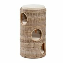 Die harmonische Farbgebung und Natürlichkeit des hier verwendeten Rattangeflechts spricht Tier und Mensch an. In den drei, voneinander getrennten Höhlen, laden weiche Kissen zu einem Nickerchen ein. Auf dem Turm kann es sich der Beobachtungsposten ebenfalls auf einem Kissen gemütlich machen. So ist der Katzenturm auch für mehrere Katzen ein praktisches Wohnmöbel. Der Bezug der Kissen ist Dank dem eingearbeiteten Reißverschlusses abnehmbar und für Handwäsche geeignet. Die Eingänge haben jeweils einen Durchmesser von ca. 17 cm.