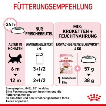 ROYAL CANIN® Sterilised Kitten in Soße wurde speziell für die Ernährungsbedürfnisse von kastrierten Kätzchen in der „Entwöhnungsphase“ ihres Wachstums entwickelt. Diese Rezeptur ist für 6 bis 12 Monate alte kastrierte Kätzchen geeignet, da sie zu dem Zeitpunkt eine bedeutende Phase durchlaufen, in der sich der Körper und das Verhalten verändert.