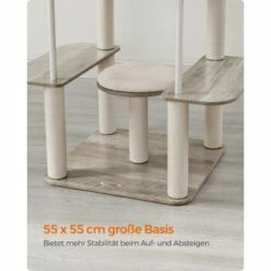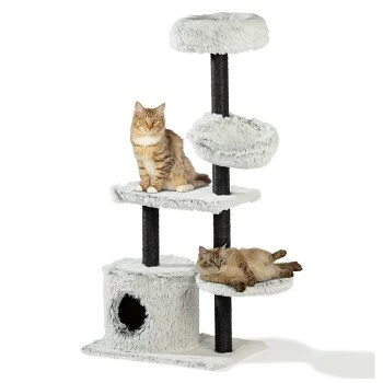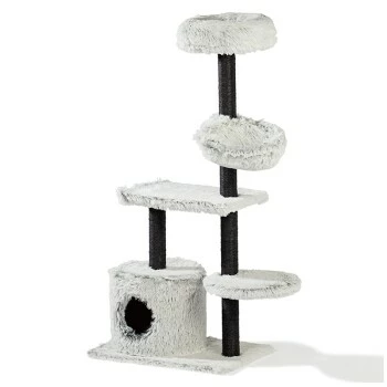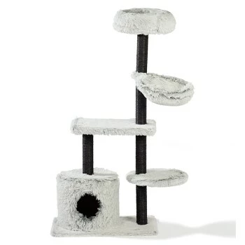 Der interessante Farbverlauf bei diesem langflorigem Plüsch ist ein echter Hingucker, was durch die, mit schwarzem Sisal, umwickelten Holme noch verstärkt wird. Aber nicht nur optisch sondern auch was die Bequemlichkeit betrifft, hat der Katzenbaum Lia einiges zu bieten. Eine kuschelige Höhle mit halbrunder Mulde auf dem Dach zum Schlafen und Verstecken, eine runde und eine extra große Liegeplatte auf der sich herrlich Fellpflege betreiben lässt, eine Hängemulde zum Beobachten und das Highlight eine runde Liegemulde mit gepolstertem Rand zum Hineinkuscheln. Für Action sorgen die stabilen Holme an denen es sich Klettern und die Krallen pflegen lässt. Die Lieferung erfolgt zerlegt inkl. Aufbauanleitung.