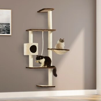 Rauf und Runter kann die Katze hier toben, ohne dass der Kratzbaum umfällt. Die intelligente Befestigungsmöglichkeit an der Wand macht dies möglich. Zudem können Sie bestimmen in welcher Höhe der Wandkratzbaum angebracht wird und so den Kratzbaum bestmöglichst in Ihr Wohnambiente einbinden. Die Liegeflächen, eine Höhle und die Kuschelmulde bieten Platz zum Beobachten und Schlafen. Die sisalumwickelten Holme sind ideal zum Klettern und zur Krallenpflegen. Für Spaß und Unterhaltung sorgt das Sisal-Spielseil. Benötigtes Befestigungsmaterial und eine Montageanleitung sind im Lieferumfang enthalten.