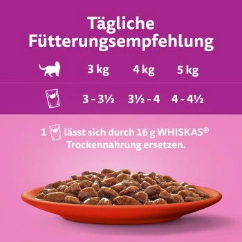 Hochwertiges Katzenfutter in Sauce für Katzen ab 1 Jahr. Verwöhne deinen Liebling mit köstlichem Nassfutter mit Rind und Lamm in der Großpackung. Bereite deiner Katze eine Freude! Speziell zubereitet, um das natürlich Gute und Köstliche der hochwertigen Zutaten zu bewahren. Mit unseren Lieblingsmahlzeiten eilt deine Katze schneller als je zuvor zum Napf! Vom verspielten Kätzchen bis zur wunderbar älteren Katze enthalten unsere schmackhaften Rezepturen alles, was deine Katze für ihr Alter braucht. Zubereitet für zufriedenes Schurren … während der Mahlzeiten und darüber hinaus.